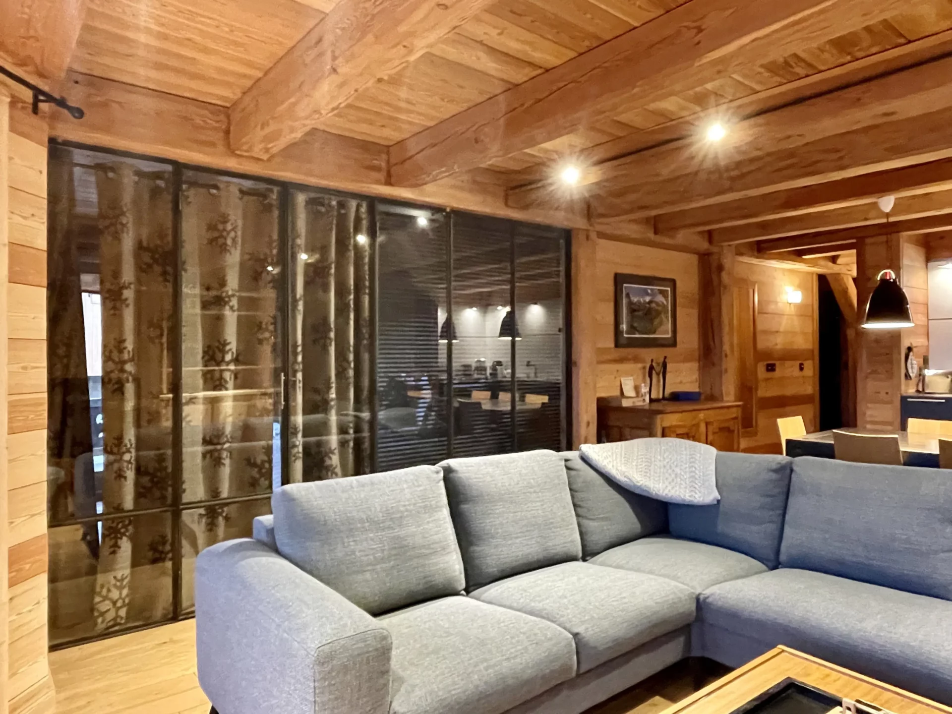 - Espace salon avec canapé d’angle et cheminée