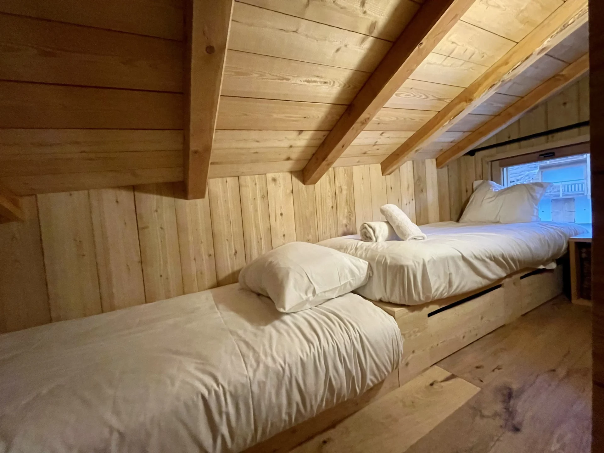 - 1 coin enfant (en enfilade) avec 2 lits simples (80) : hauteur limitée