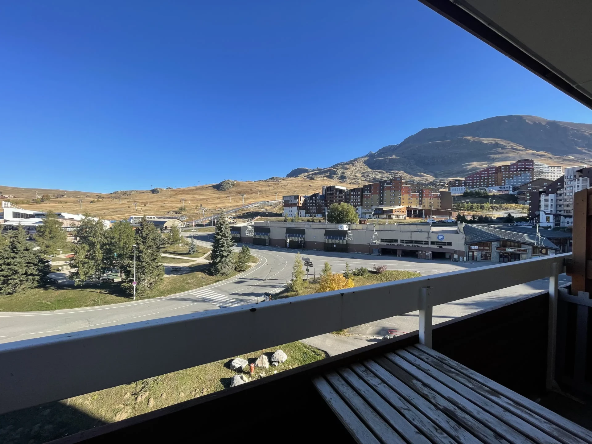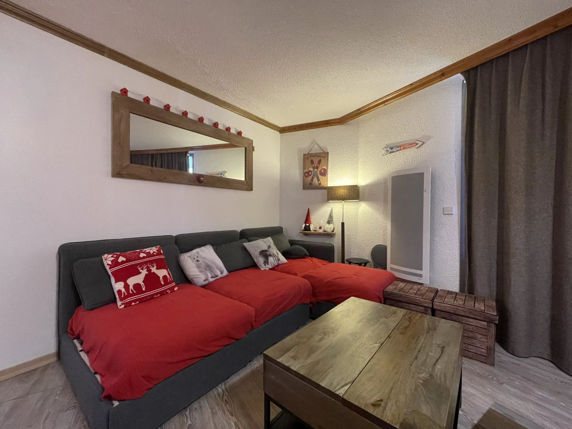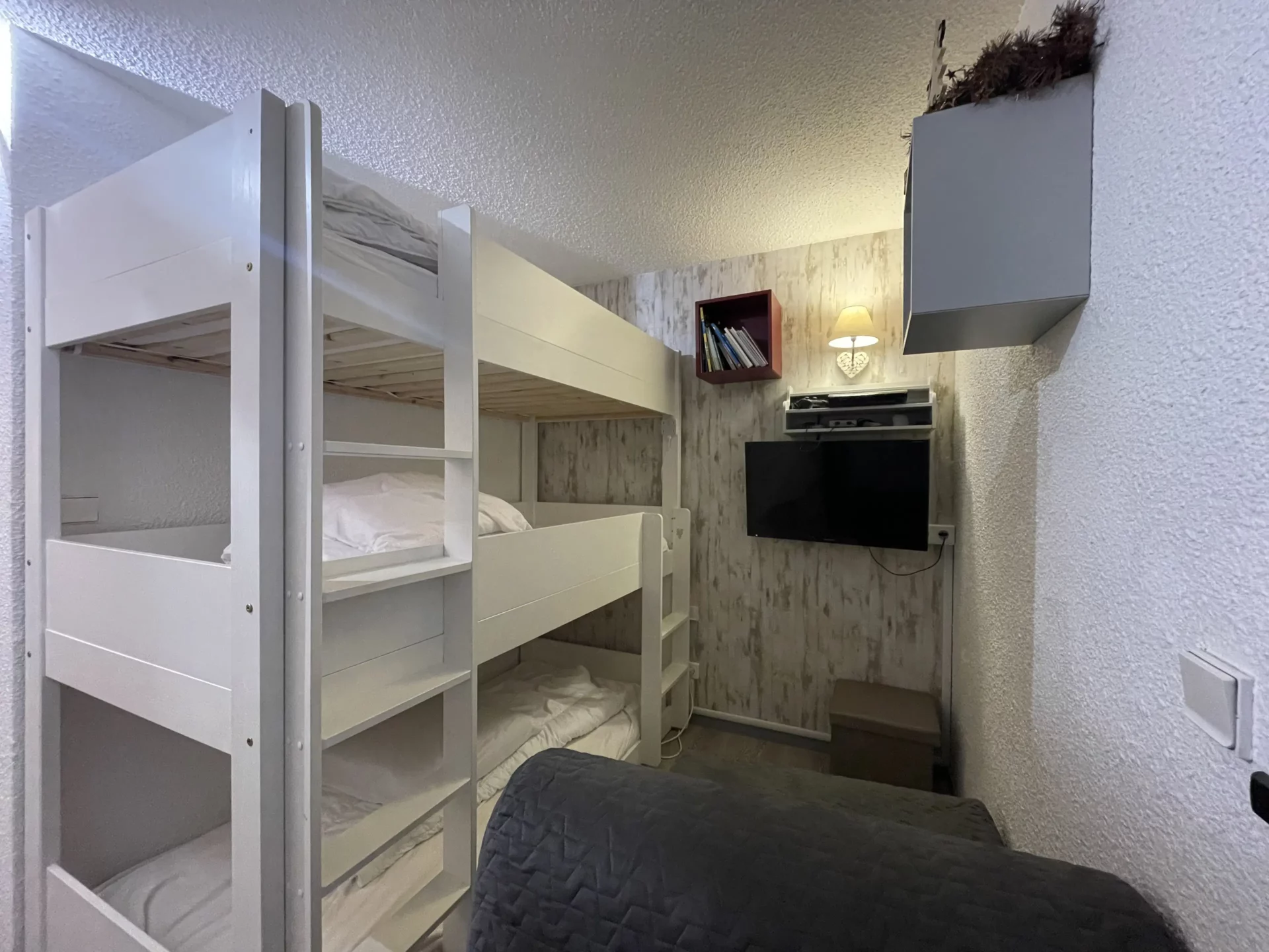 L’appartement les Bergers B502 offre une pièce de vie ouvrant sur un balcon aménagée et vue dégagée, 1 chambre avec lit double et 1 coin nuit (fermé par un rideau occultant) avec 4 lits simples (3 lits superposés et 1 lit d’appoint).