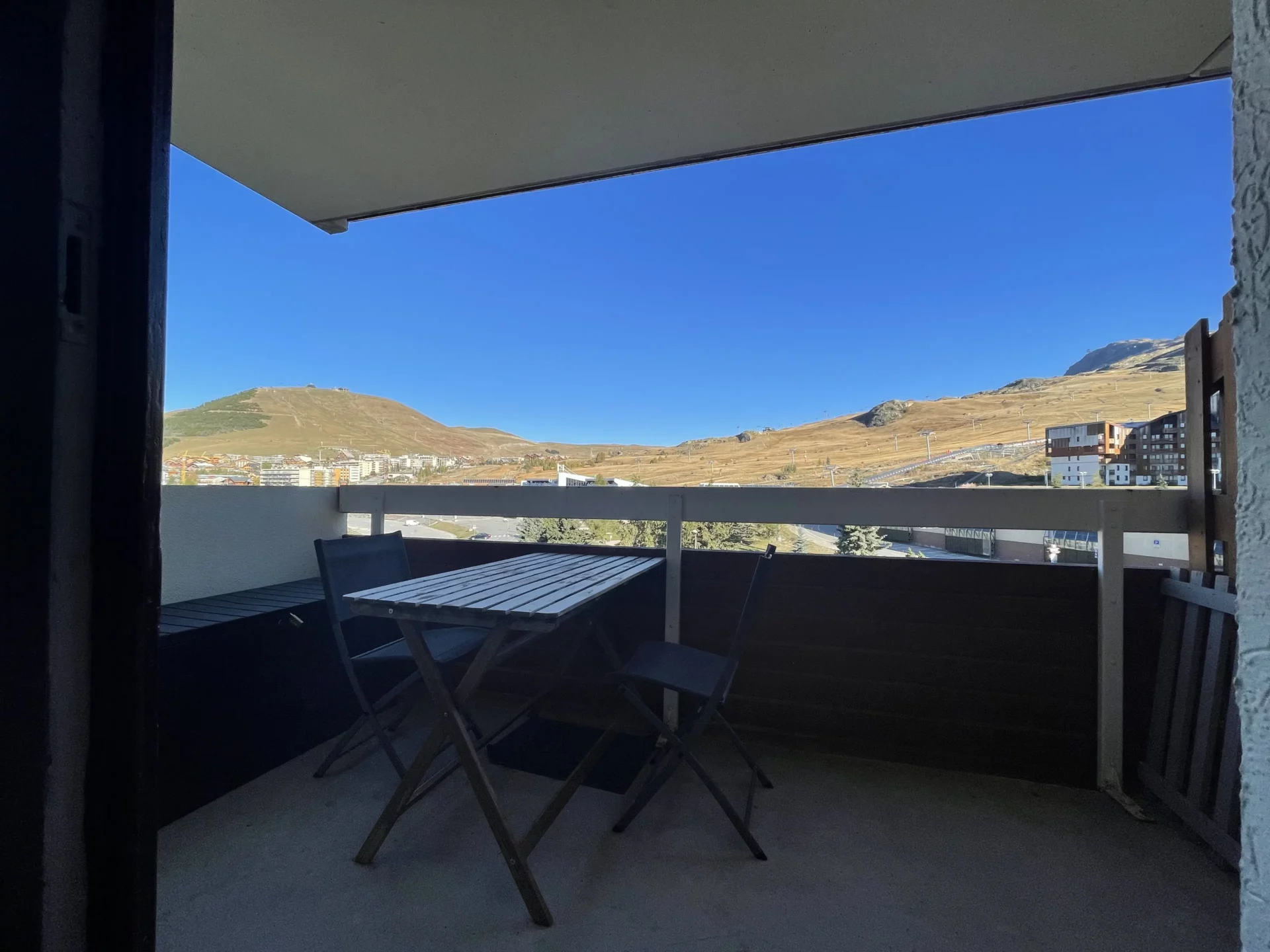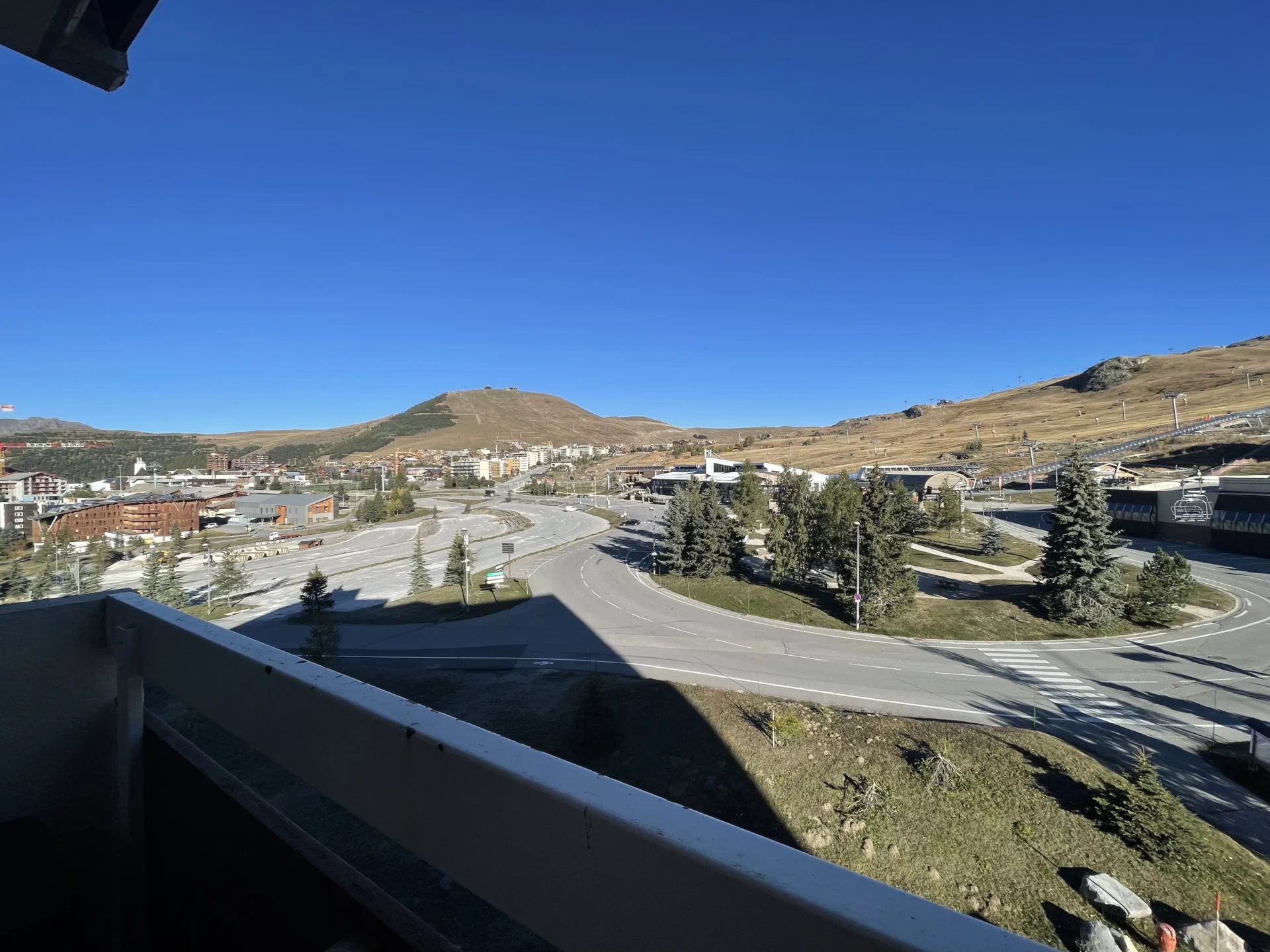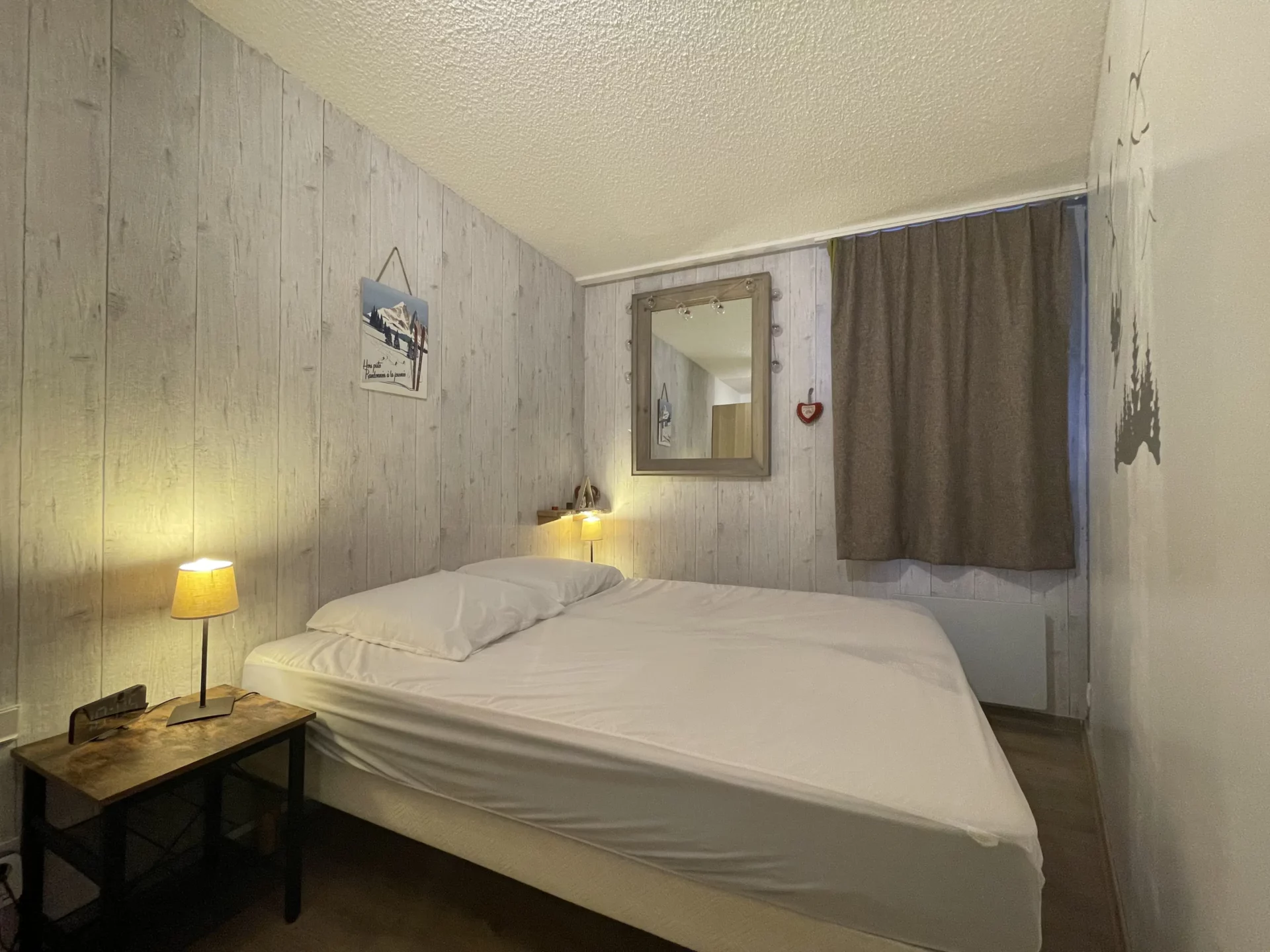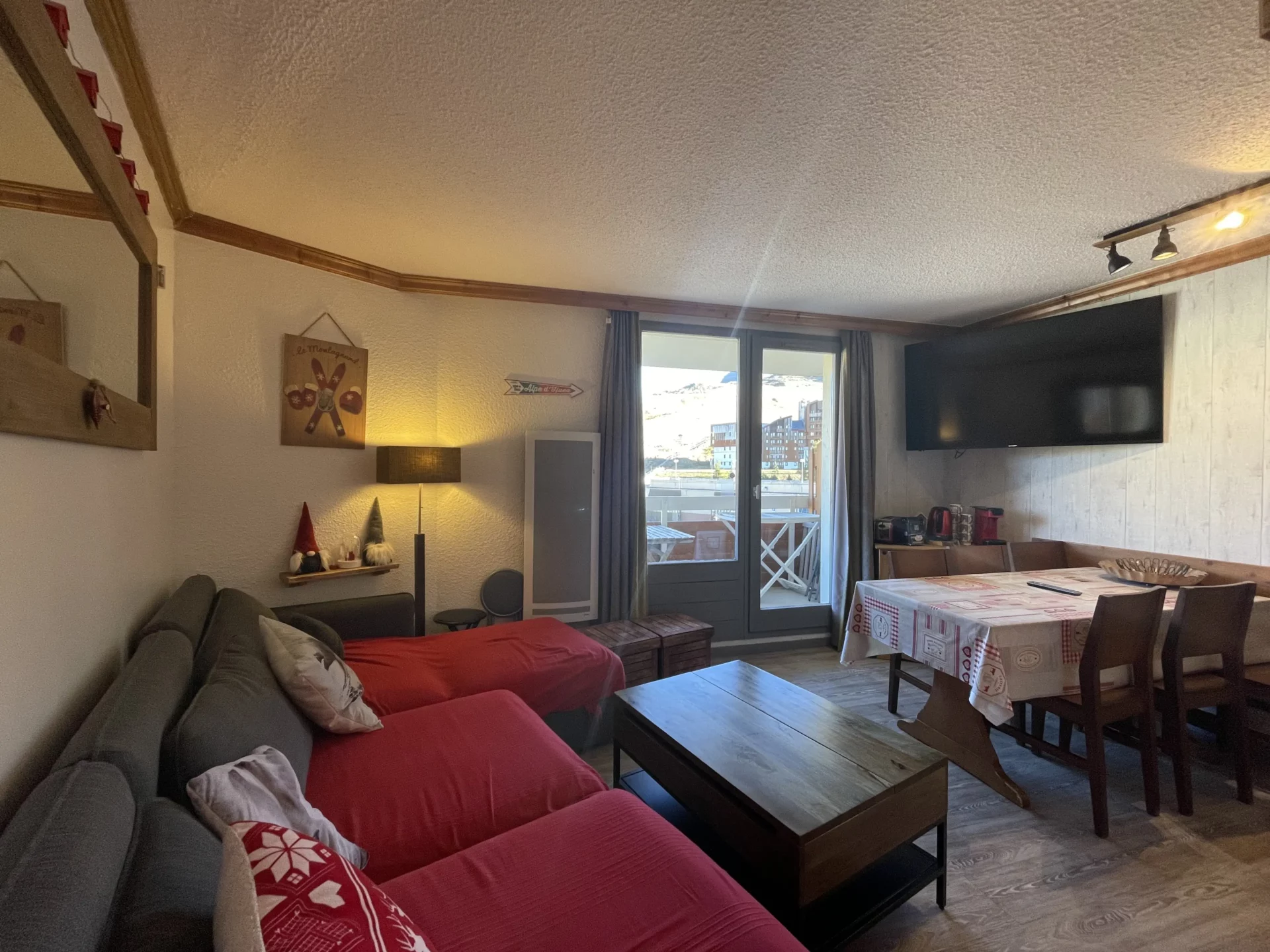 L’appartement les Bergers B502 offre une pièce de vie ouvrant sur un balcon aménagée et vue dégagée, 1 chambre avec lit double et 1 coin nuit (fermé par un rideau occultant) avec 4 lits simples (3 lits superposés et 1 lit d’appoint).