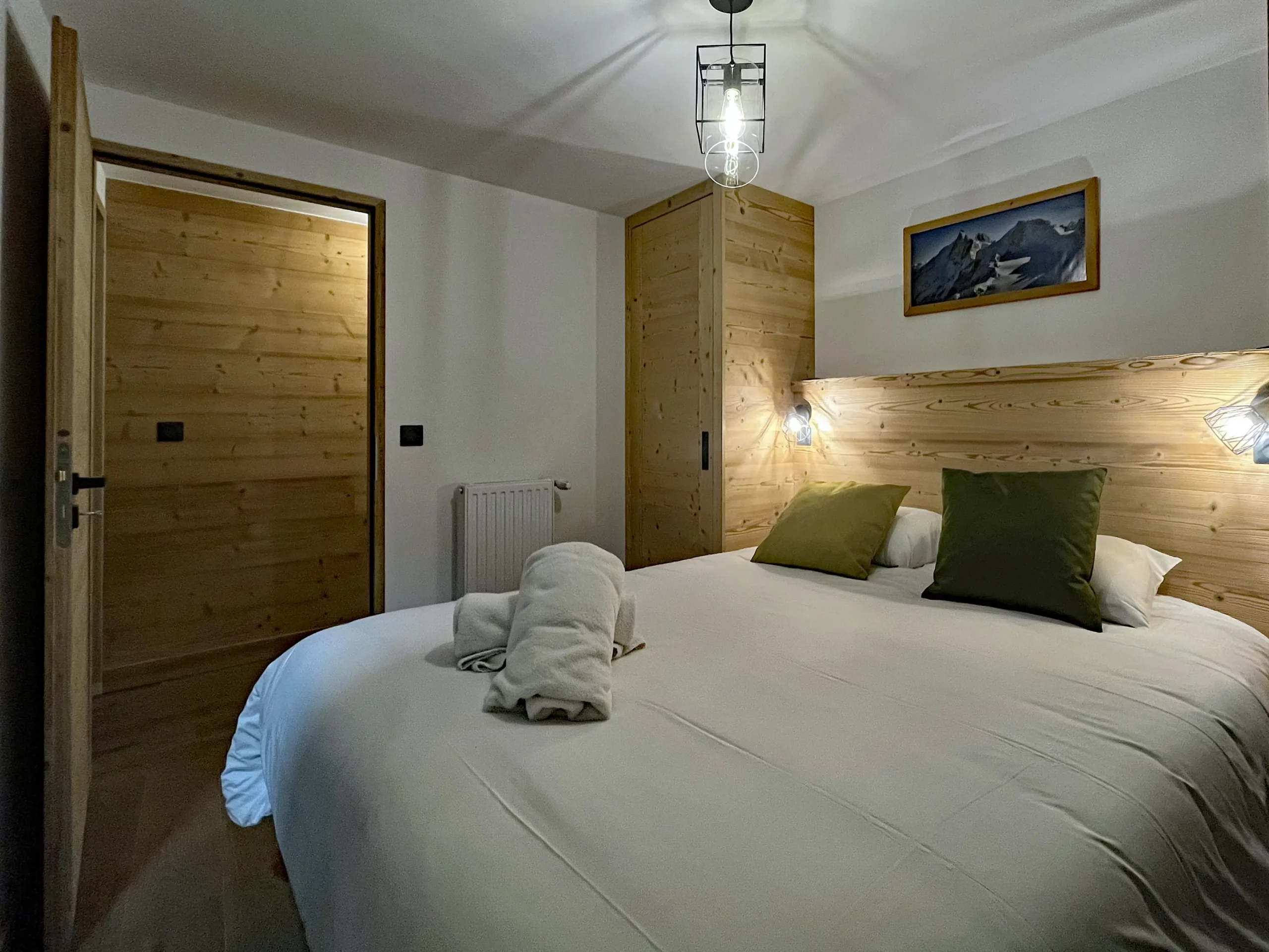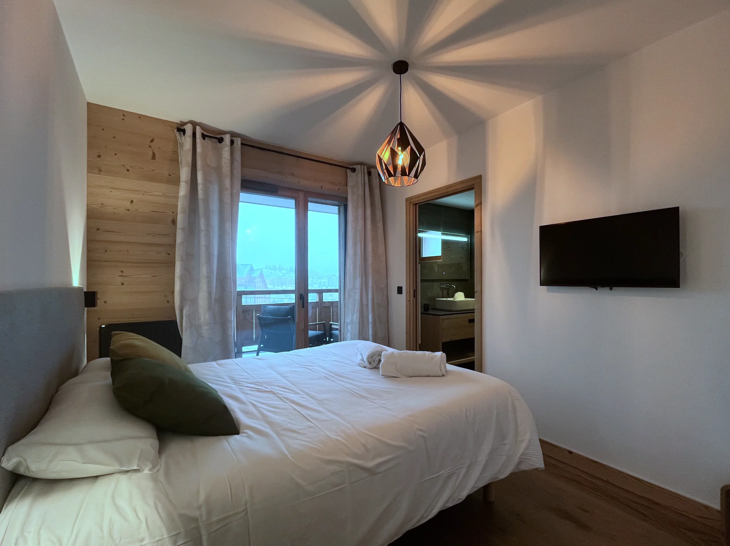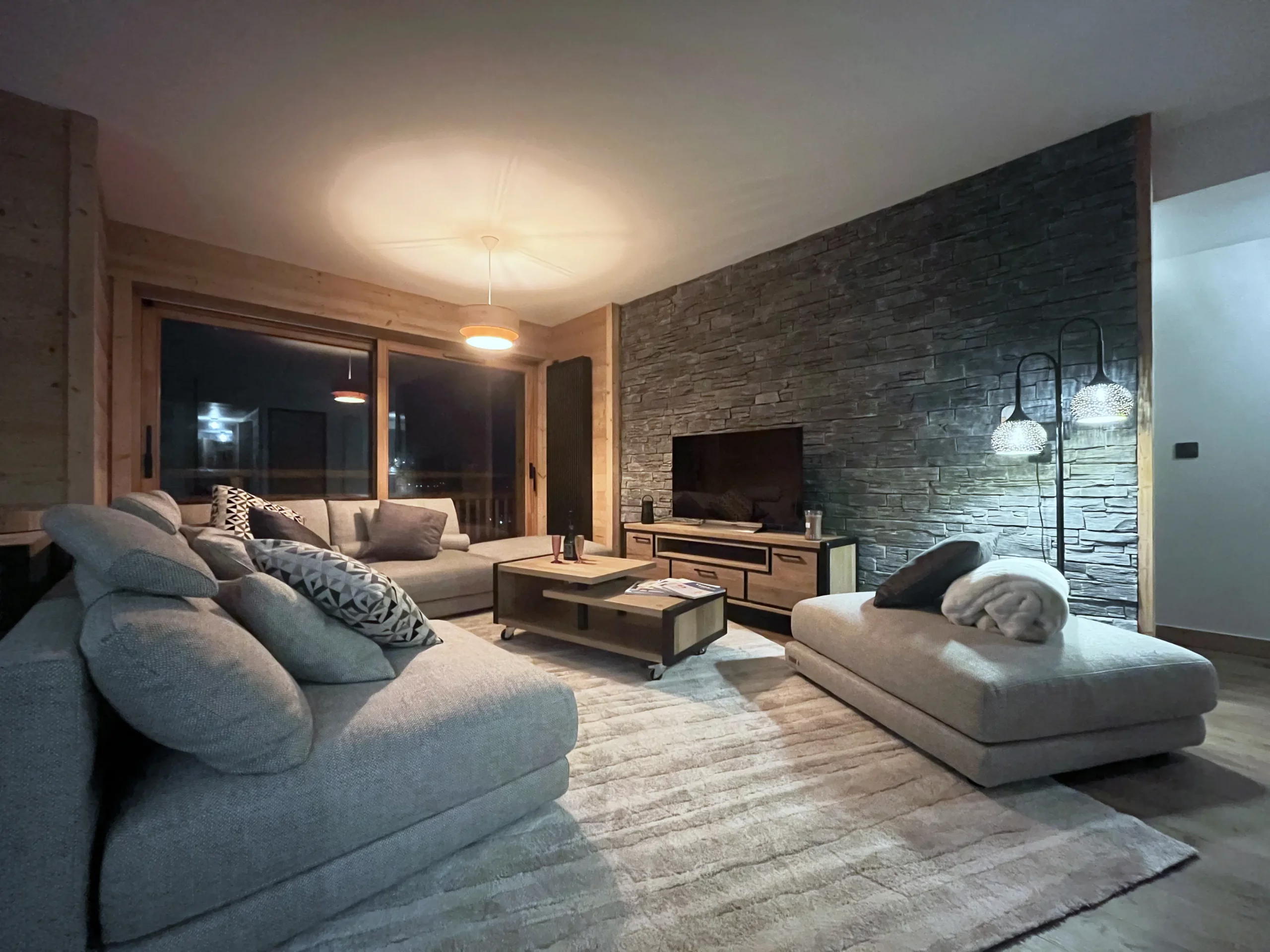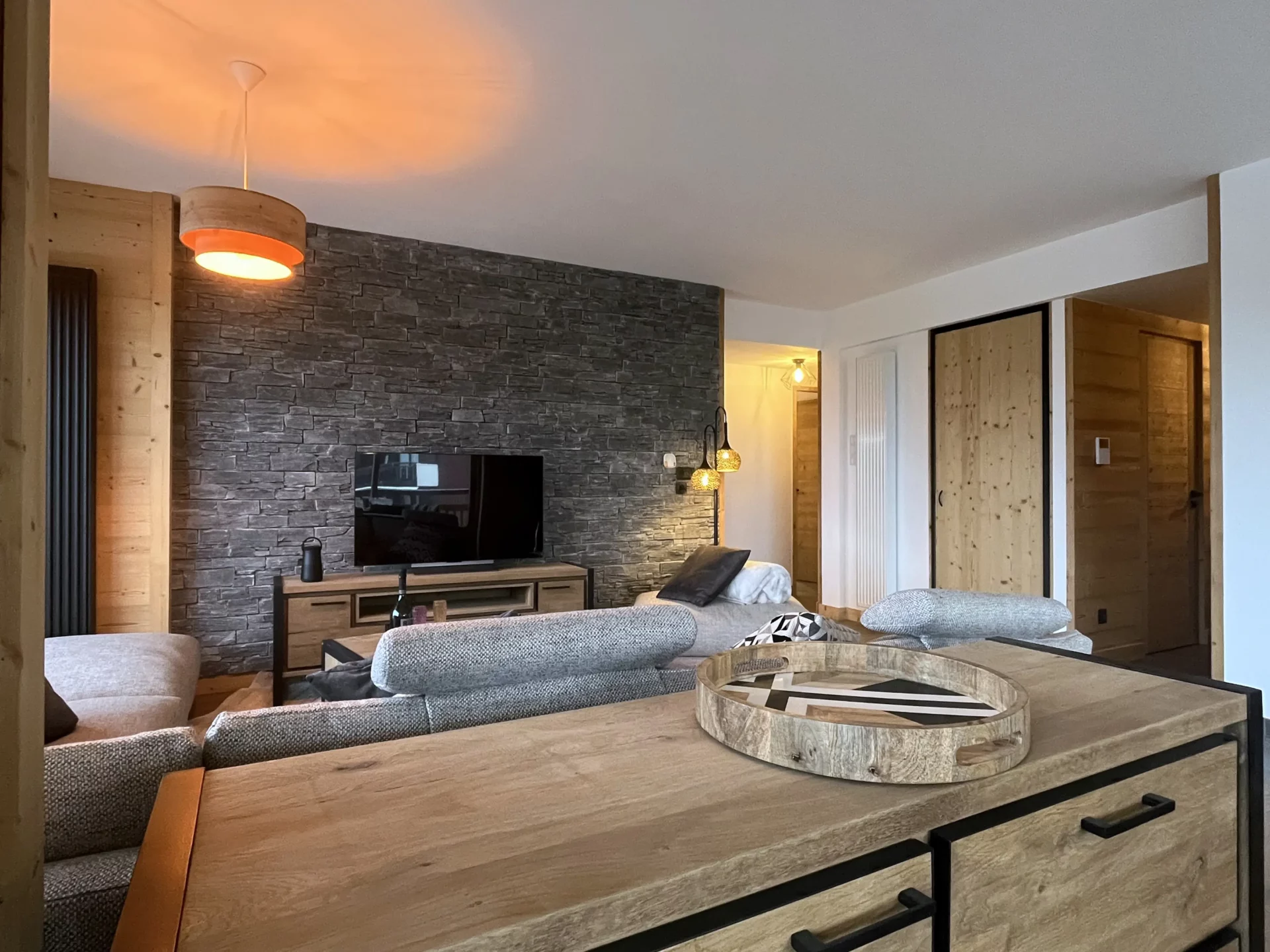 Dès l’entrée dans la pièce de vie, vous serez séduits par les volumes généreux et la lumière naturelle qui baigne l’espace grâce aux grandes baies vitrées. La pièce de vie s’articule autour d’un salon convivial, avec un grand canapé d’angle, une TV grand écran, et un accès direct à la terrasse offrant une vue imprenable sur les massifs environnants. La cuisine ouverte, moderne et entièrement équipée permet de préparer vos repas tout en partageant des moments de convivialité autour de la grande table familiale. L’appartement propose une configuration pensée pour le confort et l’intimité de chacun grâce à ses 2 suites parentales et sa chambre familiale, chacune offrant une ambiance douce et apaisante, sublimée par des matériaux nobles et des teintes naturelles, pour un véritable repos après la glisse.