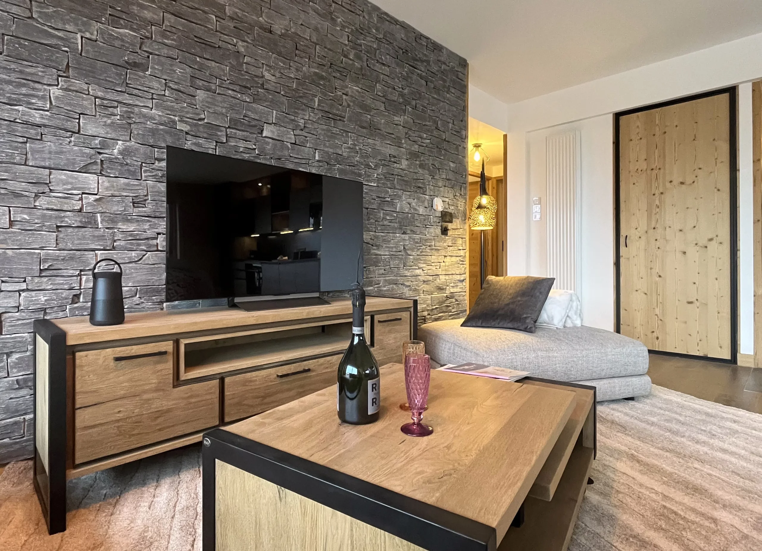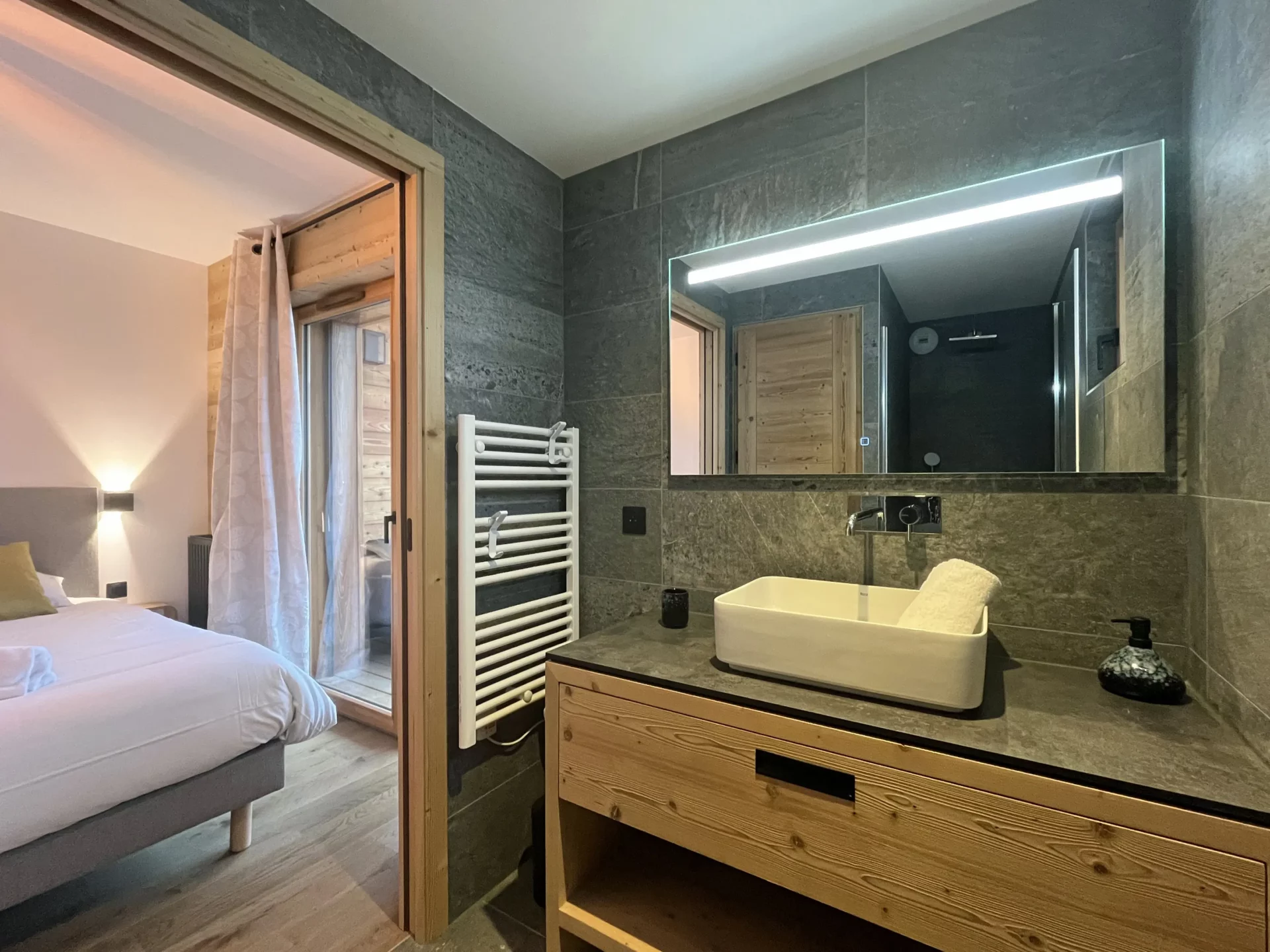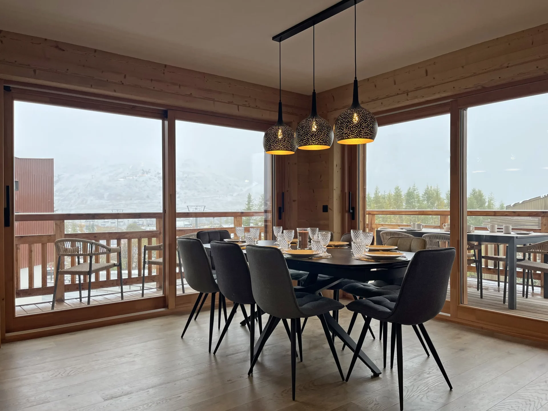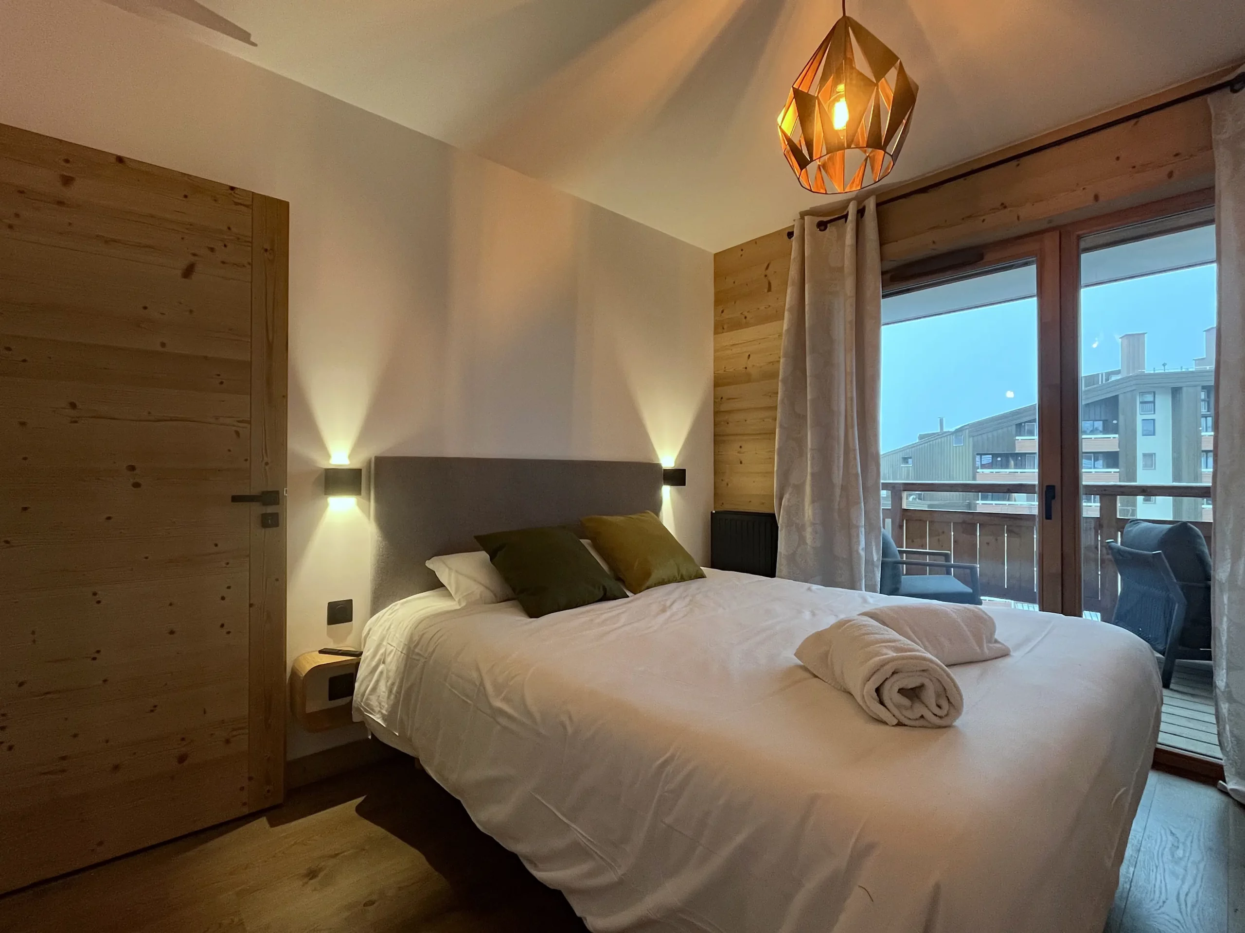 Dès l’entrée dans la pièce de vie, vous serez séduits par les volumes généreux et la lumière naturelle qui baigne l’espace grâce aux grandes baies vitrées. La pièce de vie s’articule autour d’un salon convivial, avec un grand canapé d’angle, une TV grand écran, et un accès direct à la terrasse offrant une vue imprenable sur les massifs environnants. La cuisine ouverte, moderne et entièrement équipée permet de préparer vos repas tout en partageant des moments de convivialité autour de la grande table familiale. L’appartement propose une configuration pensée pour le confort et l’intimité de chacun grâce à ses 2 suites parentales et sa chambre familiale, chacune offrant une ambiance douce et apaisante, sublimée par des matériaux nobles et des teintes naturelles, pour un véritable repos après la glisse.