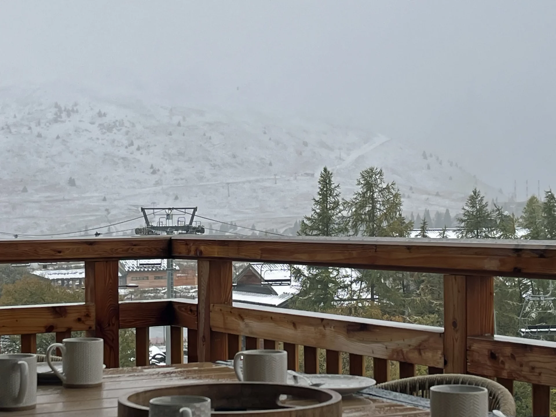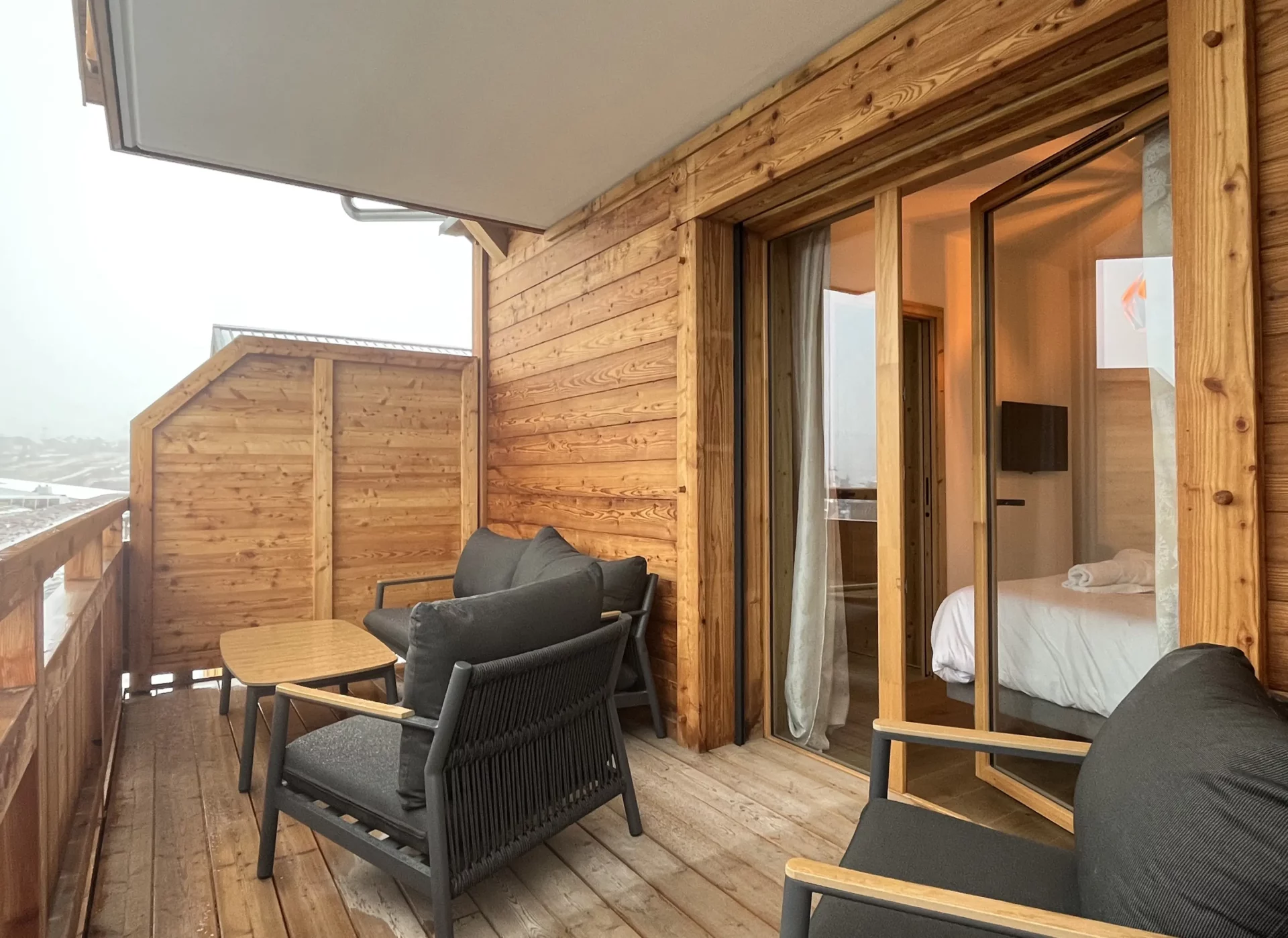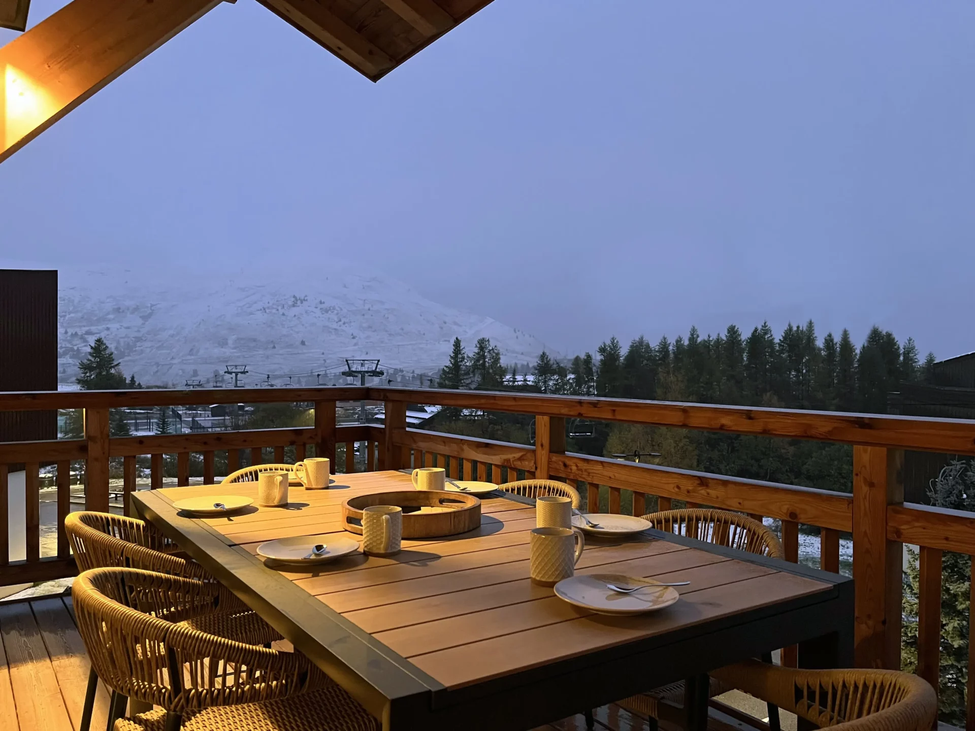 Prolongez vos instants de détente à l’extérieur : la terrasse aménagée propose un coin repas et un espace lounge, parfaits pour profiter du soleil et de la vue sur les montagnes.