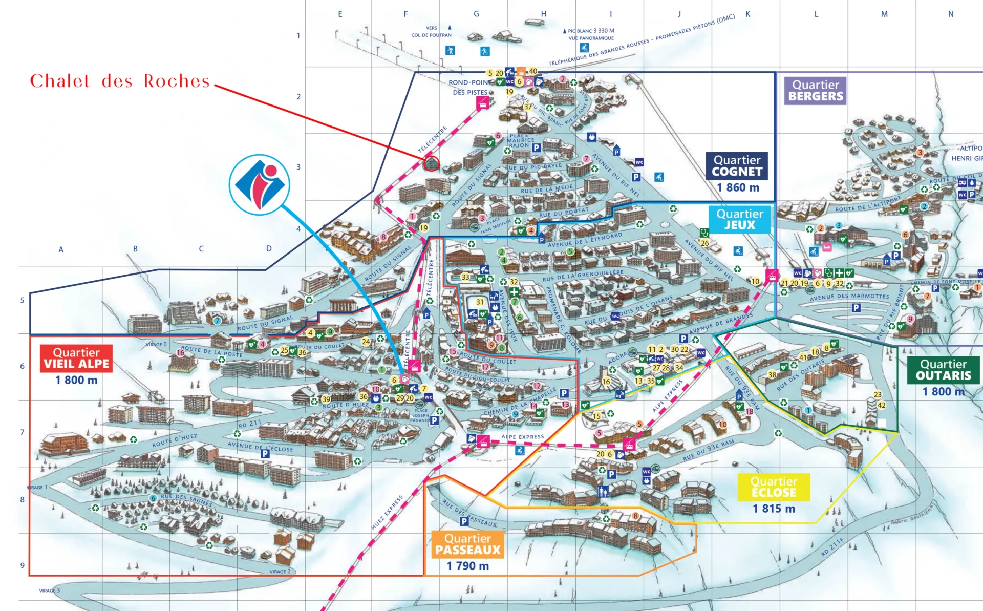Départ et retour Skis au pied via le télésiège de la Grande Sûre qui vous emmène en haut du Signal. Arrêt Télécentre à 150 m pour rejoindre le Rond-Point des pistes (Télécabine des Grandes Rousses - Point de rendez-vous ESF). Descente en skis par la piste qui traverse l'Alpe d'Huez et descendre jusqu'à l'Alpe Express pour rejoindre les Bergers et le chalet des enfants (Point de rendez-vous ESF pour enfants dès 2 ans 1/2).