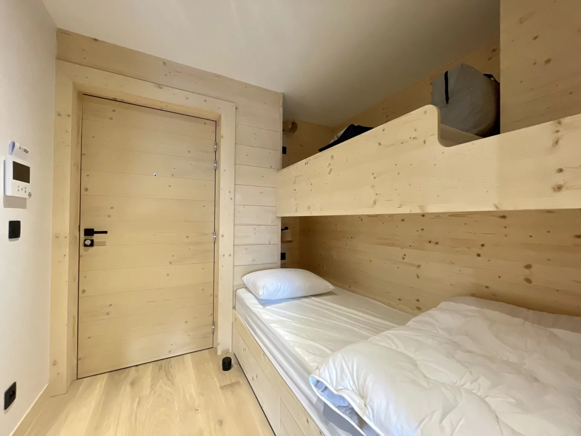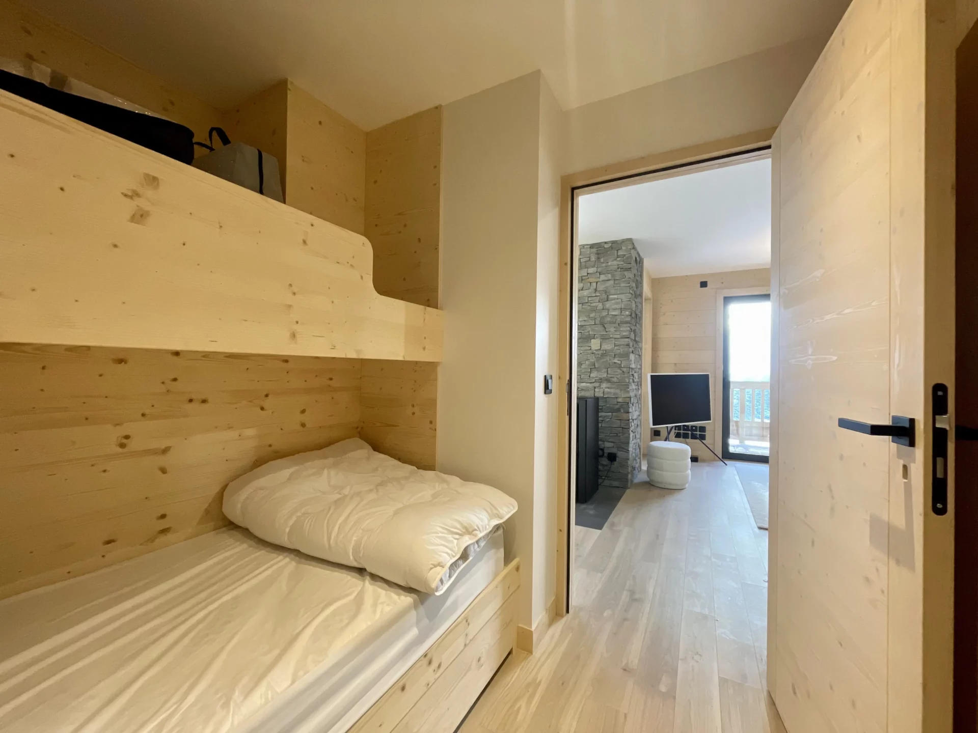 - coin montagne (porte fermée vers la pièce de vie) avec 2 lits simples superposés (90 cm)