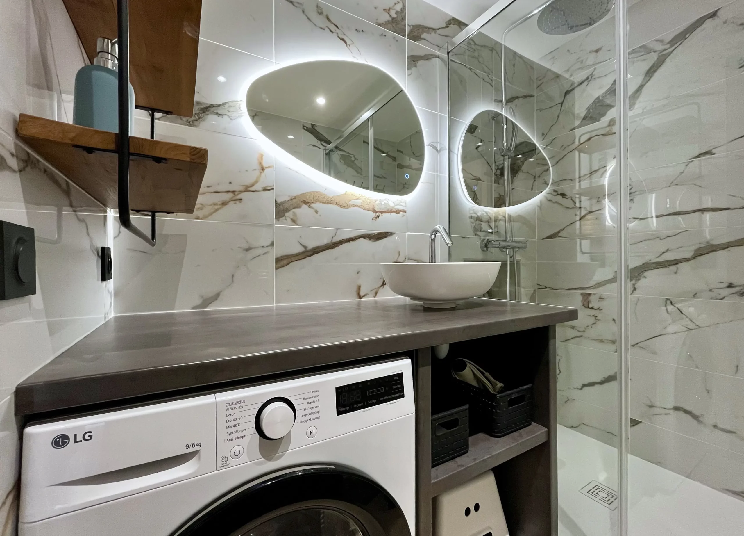 CET APPARTEMENT EST EN COURS DE RENOVATION COMPLETE et SERA PRET POUR LA SAISON HIVER : bois sur les murs, douches à l’italienne, cuisine de la marque MOBALPA, cheminée électrique,…