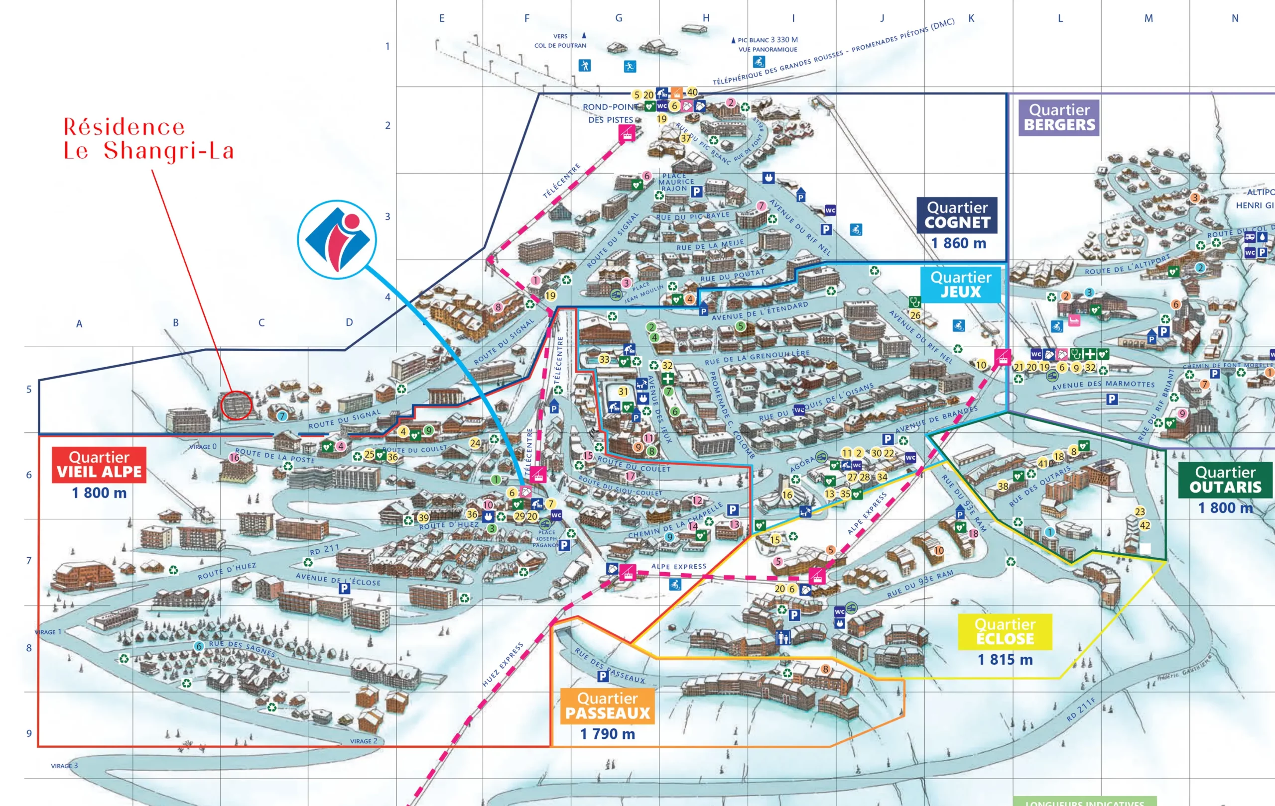 Départ et retour à 50m via le télésiège de la Grande Sûre qui vous emmène en haut du Signal. Navettes gratuites (100m) pour rejoindre les Bergers et le chalet des enfants (Point de rendez-vous ESF pour enfants dès 2 ans 1/2) ou le Rond-Point des pistes (Télécabine des Grandes Rousses - Point de rendez-vous ESF)