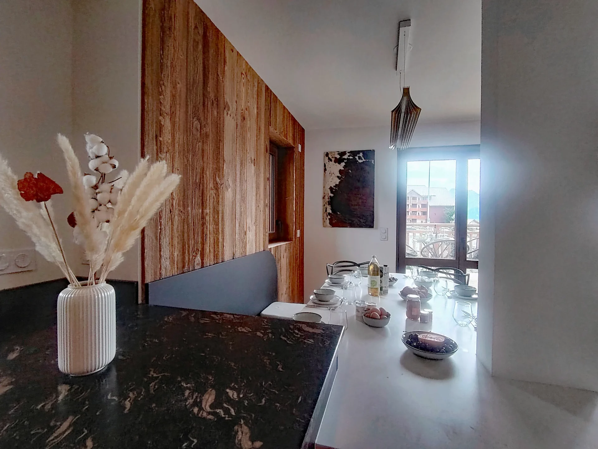 Dans cette résidence Premium, l’appartement B31 de 75 m², décoré par un architecte d’intérieur, vous offre des prestations haut-de-gamme. C’est un bien très chaleureux et lumineux, bien conçu et décoré avec élégance. Il possède 2 chambres avec lit double dont une en-suite ainsi que d’une mezzanine aménagée (1 lit double et 1 lit simple). Sa cuisine, ouverte sur le séjour et totalement équipée, ainsi que le salon sont parfaits pour partager des moments en famille. Un balcon et une terrasse aménagée vous permettent de profiter des extérieurs à toute heure de la journée. Ce bien bénéficie également d’un garage avec prise électrique et d’une place de parking dans le garage souterrain de la résidence.