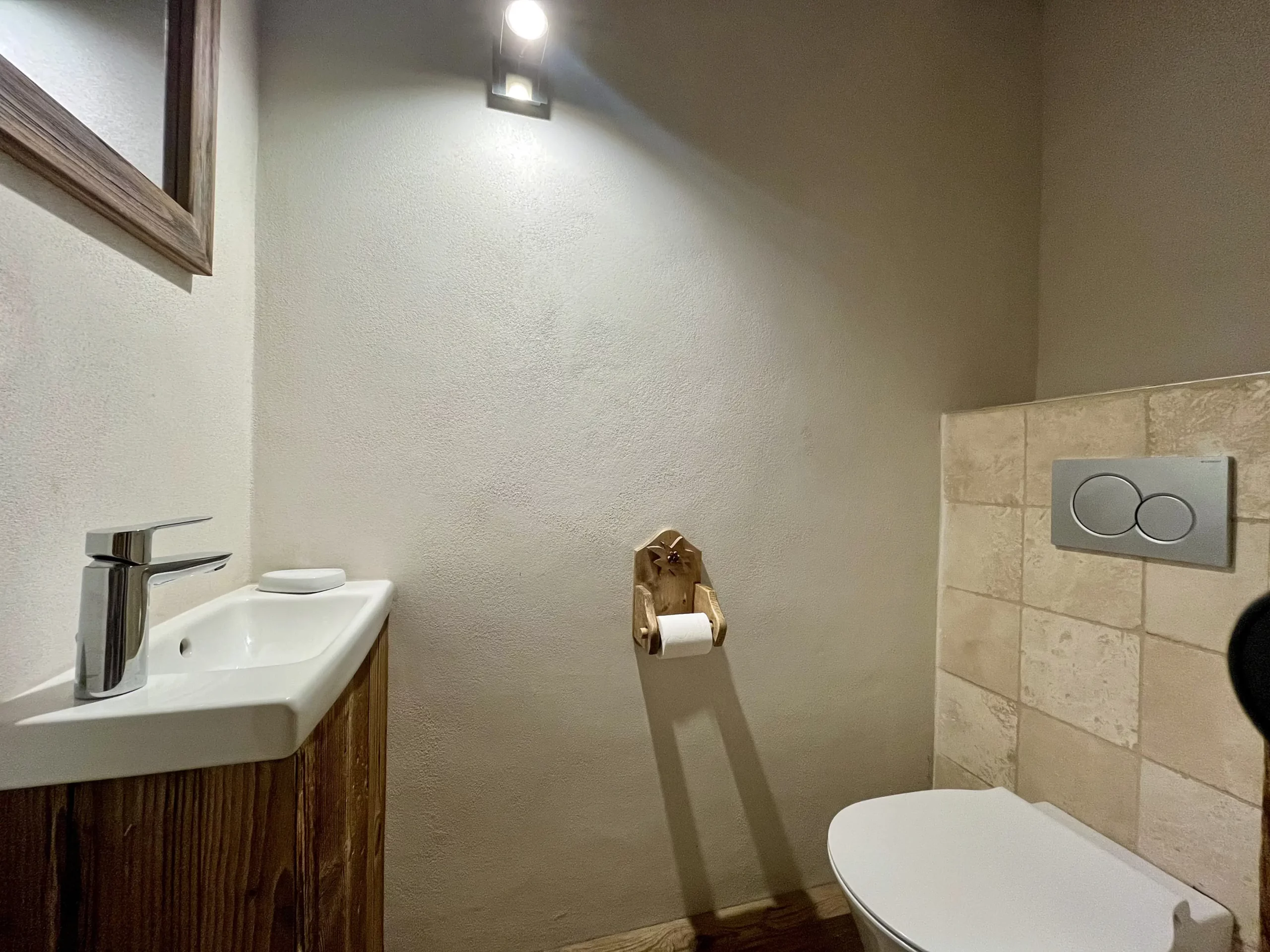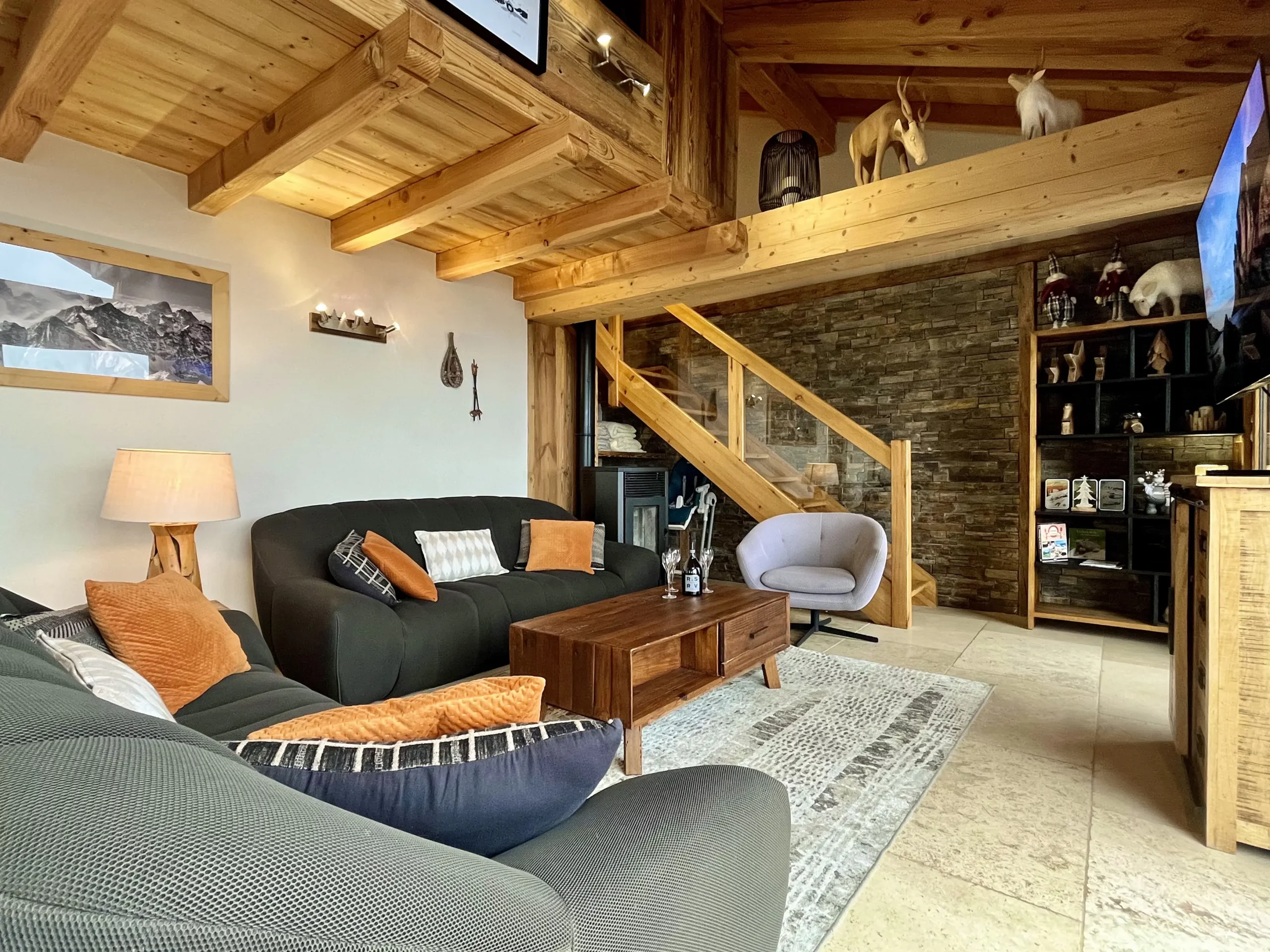 Le cœur de l’appartement est une vaste pièce de vie sous charpente bois, sublimée par une belle hauteur sous plafond et baignée de lumière grâce à ses larges baies vitrées ouvrant sur la terrasse. Le salon, convivial et cosy autour de son poêle, invite à des soirées douillettes après une journée sur les pistes. La salle à manger et la cuisine ouverte, moderne et entièrement équipée, prolongent cette atmosphère chaleureuse et conviviale. L’appartement se compose de quatre chambres confortables, dont trois suites parentales en rez-de-chaussée, chacune avec sa salle d’eau privative, ainsi qu’une suite sous les toits avec baignoire et double vasque. Un coin montagne intimiste, niché sous les poutres apparentes, complète l’espace nuit et fait le bonheur des enfants. Les prestations haut de gamme se poursuivent avec un skiroom équipé de sèche-chaussures, une buanderie pratique et une connexion internet haut débit. Une place de stationnement extérieure ainsi qu’un ascenseur facilitent l’accès à la résidence.
