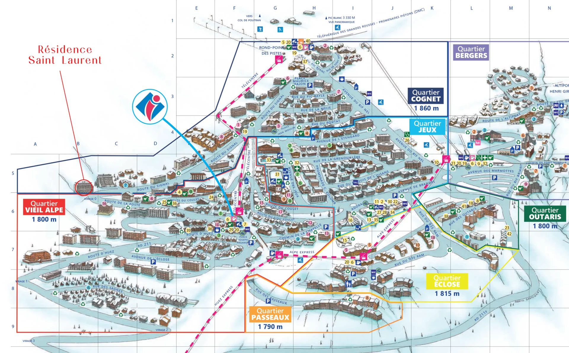 Départ et retour Skis au pied via le télésiège de la Grande Sûre qui vous emmène en haut du Signal. Navettes gratuites (100m) pour rejoindre pour rejoindre les Bergers et le chalet des enfants (Point de rendez-vous ESF pour enfants dès 2 ans 1/2) ou le Rond-Point des pistes (Télécabine des Grandes Rousses - Point de rendez-vous ESF)