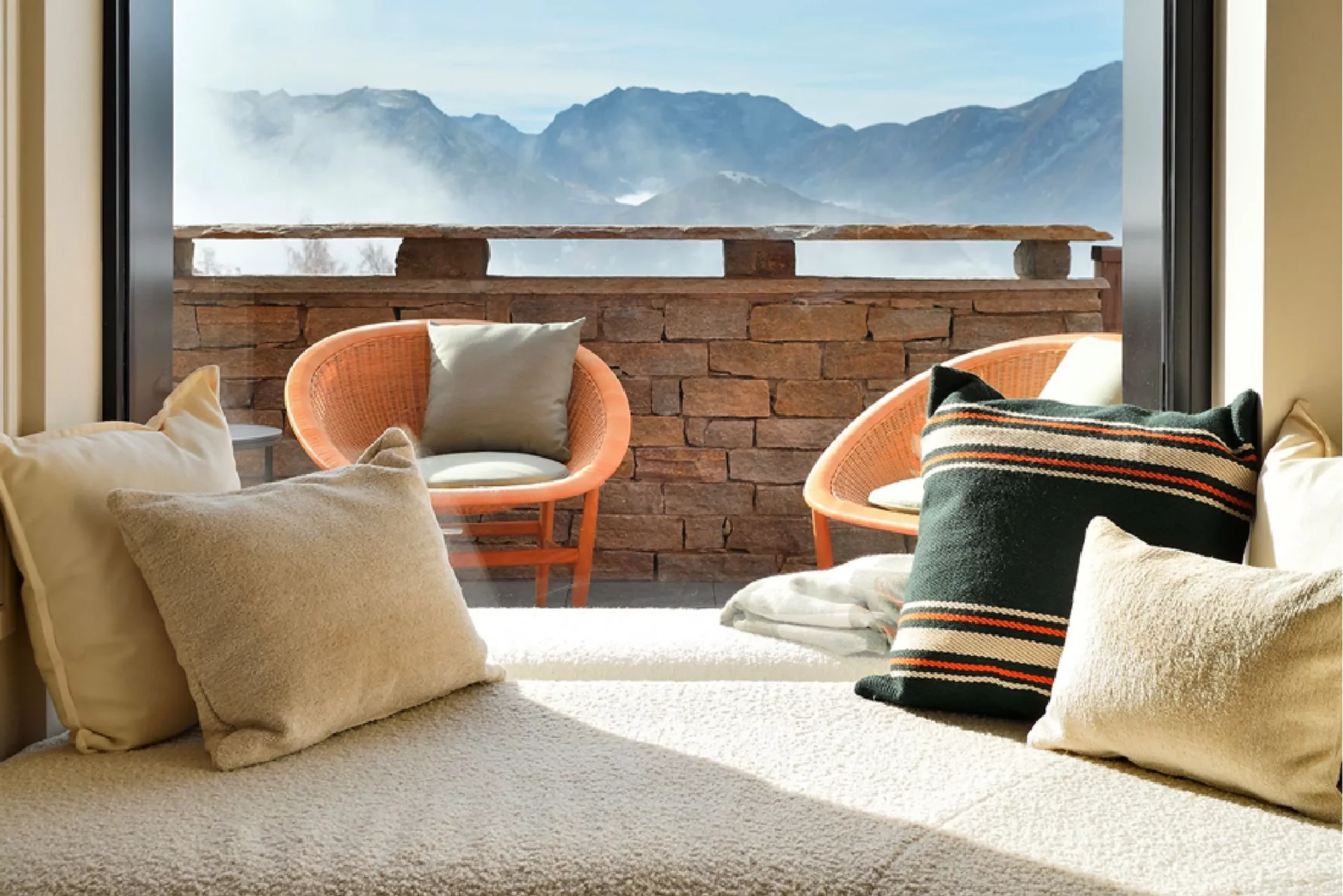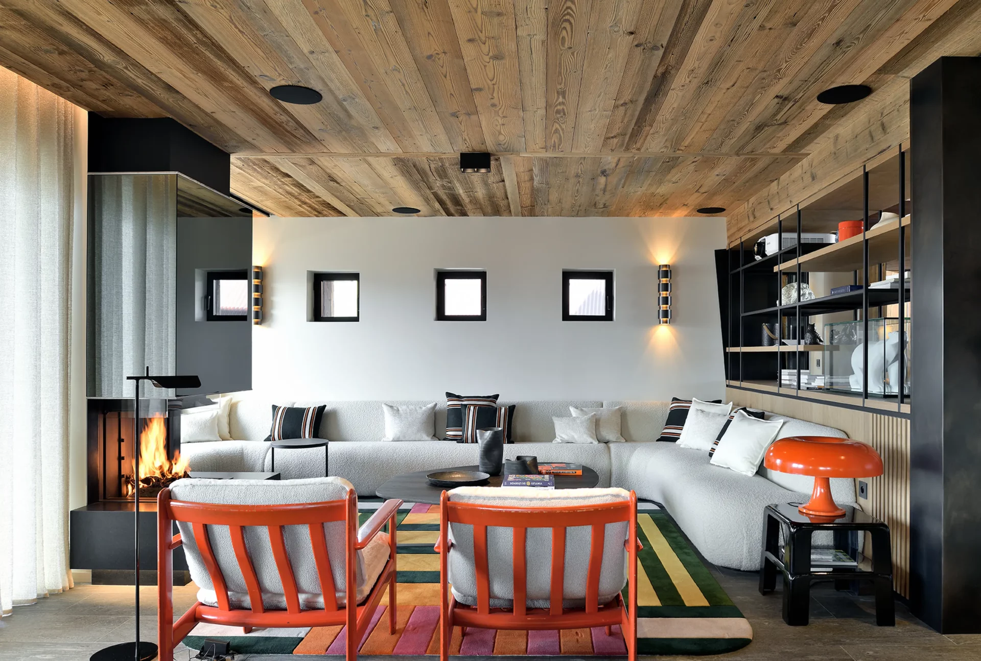 - Espace salon : canapé panoramique face à une cheminée et une grande baie vitrée qui vous offre une vue dégagée
