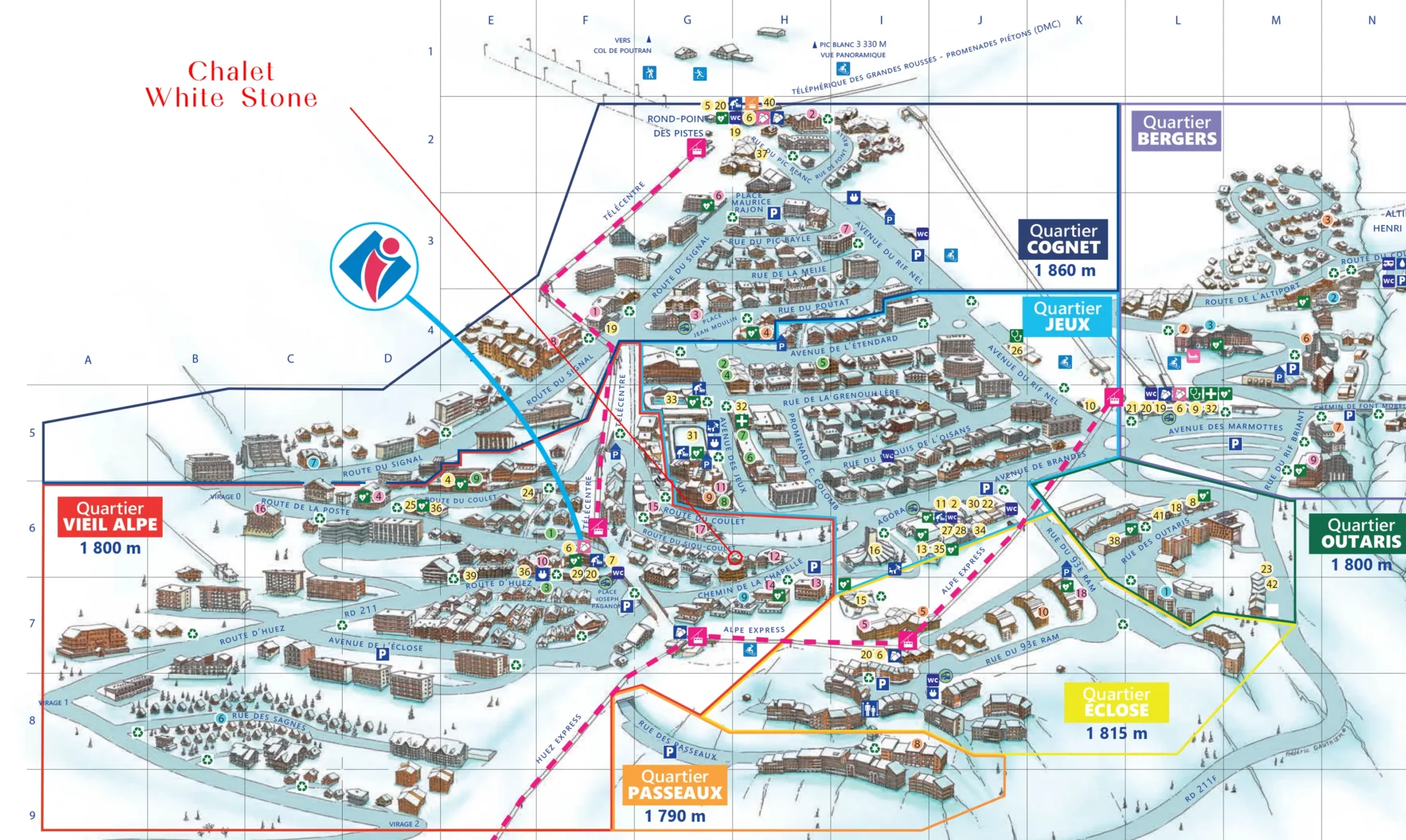 Accès rapide aux pistes à 200m, vous pourrez relier facilement le départ des cours ESF avec l'Alpe Express pour rejoindre les Bergers et le chalet des enfants (Point de rendez-vous ESF pour enfants dès 2 ans 1/2) ou grâce au Télécentre pour rejoindre le Rond-Point des pistes (Télécabine des Grandes Rousses - Point de rendez-vous ESF). Navettes gratuites depuis la Place Paganon (100m) pour rejoindre le Rond-Point des Pistes ou les Bergers.